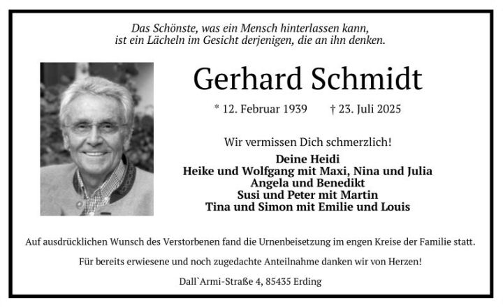 Am 23. Juli 2025 ist der Initiator, Gründer und langjährige Vorsitzende des Historischen Vereins Erding e.V., Gerhard Schmidt, im 87. Lebensjahr verstorben. 20 Jahre lang, von 1978 bis 1998 hat er dem Verein als erster Vorsitzender vorgestanden. Nach vielen Treffen und Vorgesprächen mit stadtgeschichtlich und kulturell Interessierten sowie politischen Vertretern Erdings hatten sich am 4. Dezember 1978 - am Ende des Festjahrs zur 750-Jahr-Feier der Stadt Erding Gerhard Schmidt und weitere 40 kultur-, kunst- und heimatgeschichtlich begeisterte Bürgerinnen (12) und Bürger (29) in der damals noch bestehenden Bahnhofsgaststätte eingefunden, um den Historischen Verein Erding zu gründen. Die Teilnehmerinnen und Teilnehmern der Gründungsversammlung unter Leitung von Gerhard Schmidt legten den Zweck des Vereins fest: Pflege der Heimatkunde und Geschichte durch Veranstaltungen wie Vorträge, Ausstellungen, Führungen und Studienfahrten! In der im Vereinsarchiv befindlichen handschriftlich verfassten Begrüßungsrede von Gerhard Schmidt und dem Protokoll des Abends sind viele Ziele, Denkanstöße und Ideen des Vereins genannt: Veranstalten von Kunstausstellungen, Sammeln durch Vereinsmitglieder von Fotomaterial der Stadt Erding, Beratung bei Gestaltung von Hausfassaden, Beratung von Bürgern bei Fragen zu Objekten der Geschichte, Herausgabe einer Vereinsschrift, Errichten von Gedenktafeln, Einsetzen für Straßennamen zum Gedenken an verdiente Bürger und Bürgerinnen, Mitsprache bei Gestaltung von öffentlichen Plätzen, Begehbarmachung des Stadtturms, Fassadenpreis auch für Neubauten, Angebot von Fortbildungskursen und Seminaren, Aktvierung der Jugend durch Museumsbesuche und Jugendprogramme und vieles mehr. Bis heute fast 50 Jahre später ist der von Gerhard Schmidt und den Vereinsmitgliedern geprägte Historische Verein voller Leben. Seit fast einem halben Jahrhundert bietet der Historische Verein jeden Monat zwei Veranstaltungen an: einen Vortragsabend und eine Kulturfahrt! So hatte es am Gründungsabend Gerhard Schmidt festgelegt. Unter Gerhard Schmidts Vorstandsjahre fallen neben den genannten Veranstaltungen auch viele vom Verein organisierte „Antiquitäten-, Raritäten-, Sammler- und Trödelmärkte“ im Schlosshof Aufhausen. Neben viel Eigenleistung des Vereins wurden die jeweiligen Erlöse aus den Märkten in die Restaurierung des Althamer Kircherls St. Benedikt gesteckt, für die der Historische Verein Erding mitverantwortlich war. Eigenleistung und bewundernswerte Teamarbeit wurde auch 1979 bei der Renovierung der historischen Kegelbahn von Schloss Aufhausen an den Tag gelegt. Nicht vergessen werden darf der Einsatz gegen die 1979 geplante Verlegung des Kriegerdenkmals am Kleinen Platz! Gerhard Schmidts „Erfindung“ war auch das Ausstellungsmotto „Sammler zeigen ihre Schätze“, wo in vielen Jahren durch Bürgerbeteiligung schöne, kostbare und interessante Exponate aus privatem, aber auch öffentlichem Besitz gezeigt werden konnten. Anbringung von handbeschriebenen Kupfertafeln als Hinweise auf historisch wichtige Bauwerke war ein großes Anliegen Gerhard Schmidts. Die Aufstellung einer Nepomuk-Skulptur, 1984, Liederabende im Schloss, mehrtägige Kultur-Ausflüge, die große „Christkindl- und Fatschenkindl-Ausstellung 1991 sind nur einige Ideen, die Gerhard Schmidt zusammen mit „seinem“ Verein umgesetzt hat. Sein immenses Netzwerk, seine guten Kontakte zu Vereinen und Bürgerschaft, seine Bekanntschaft und auch Freundschaft mit Historikern, Schriftstellern und Künstlern haben den von Gerhard Schmidt ins Leben gerufenen Verein zu einem Erfolgsmodell werden lassen. Erlauben Sie mir, liebe Leserinnen und Leser, einige persönliche Worte: Mit großem Stolz und voller Freude habe ich 1998 das Vorstandsamt von meinem Vater übernommen. Ich weiß, dass er nach diesen Neuwahlen stolz war, dass nun mir die Mitglieder ihr Vertrauen geschenkt haben. In all den Jahren, in denen ich dem Historischen Verein mit wunderbaren Vorstandsmitgliedern vorstehe, konnte ich zu jeder Zeit auf das überaus große Wissen meines Vaters zurückgreifen. Seine Ratschläge, seine Meinung und auch seine Ideen waren von uns allen und besonders von mir gern gehört. Ich werde die vielen Kunstgespräche mit ihm daheim am Küchentisch, die zahlreichen Diskussionen über Kulturpolitik und das gemeinsame Wühlen in seinem reichen Fundus an Büchern und Zeitungsartikeln sehr vermissen. |